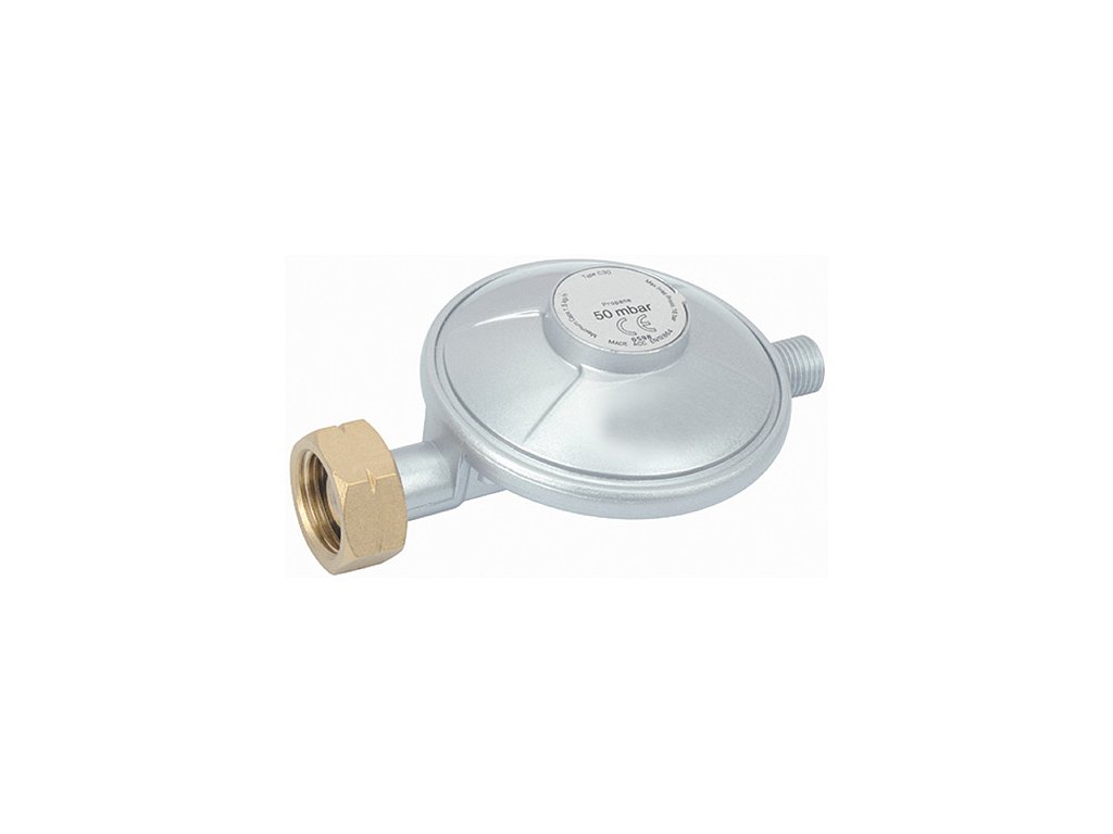 Plynový PB regulátor 50mbar, výstup G1/4"L vnější závit, jednostuňový s pevnou regulací dle EN 12864, výstupní tlak 50mbar, průtok plynu 1,5kg/h, závit 21,8 x 1,814mm, instaluje se přímo na kohout tlakové nádoby
